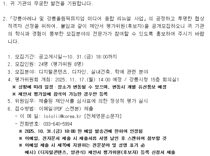 「강릉아레나 및 강릉올림픽뮤지엄 미디어 융합 리뉴얼 사업」 제안서 평가위원(후보자) 공개모집 안내