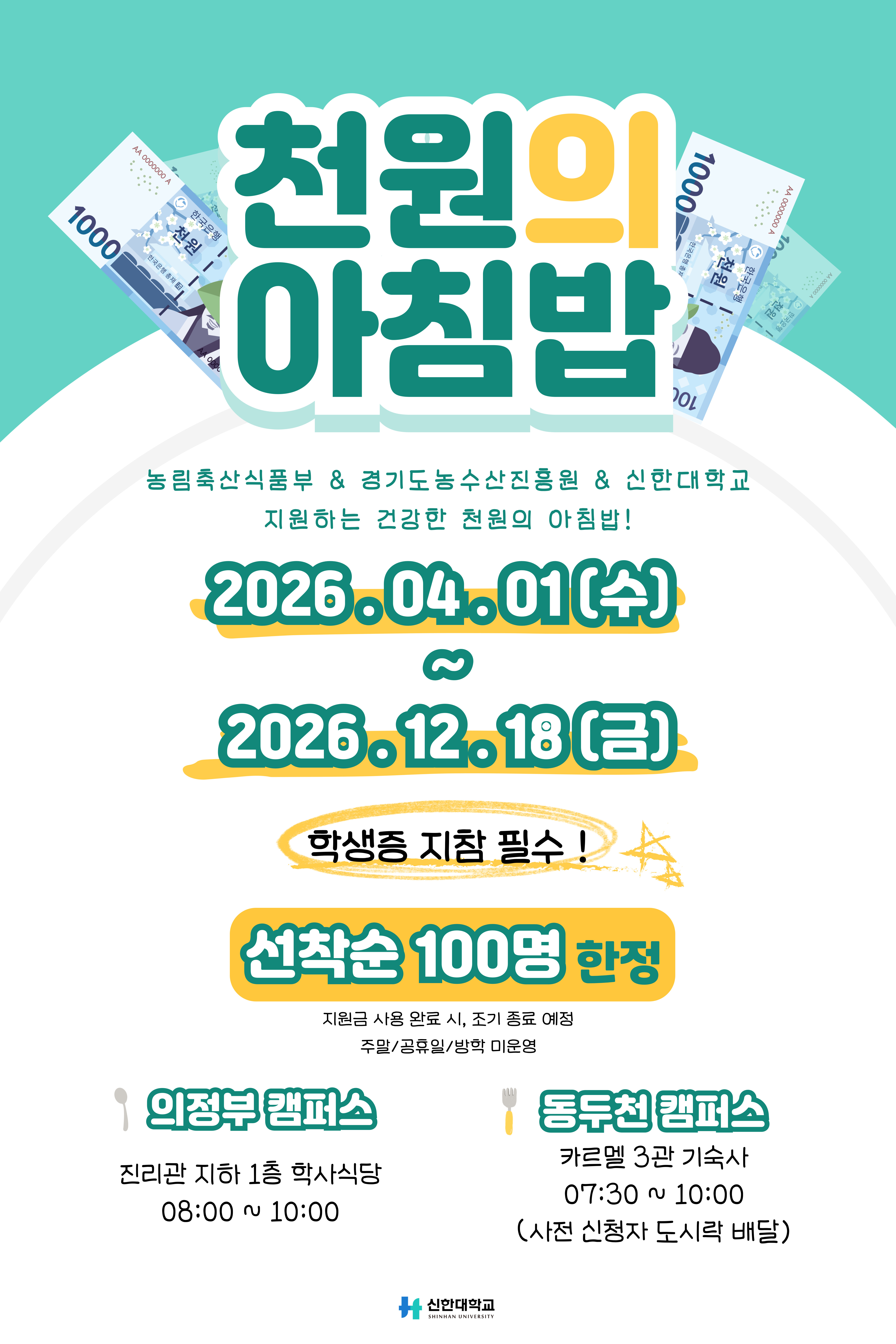 2026학년도 신한대학교 '천원의 아침밥' 사업 안내